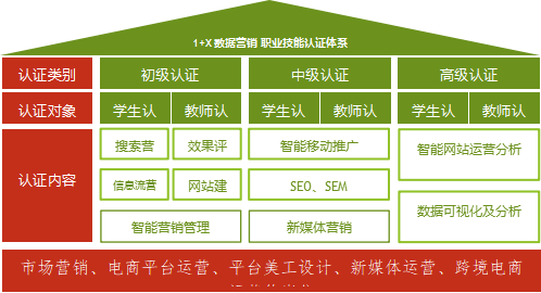 针对缺乏复合技能的实战数据营销人才这一问题,数据营销职业技能等级证书以企业的营销应用工作为依据,培养社会紧缺的具备实战技能的数据营销和智能营销人才。证书基于市场人才能力需求、技能与岗位匹配度设计等级标准,证书所涵盖职业技能满足市场营销、电商平台运营、平台美工设计、新媒体运营、跨境电商运营等岗位工作需要。使学生掌握数据营销的原理、方法、技能。